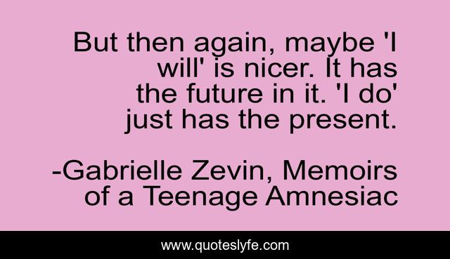 This page presents the quote "But then again, maybe 'I will' is nicer. It has the future in it. 'I do' just has the present.". Author of this quote is Gabrielle Zevin, Memoirs of a Teenage Amnesiac. .