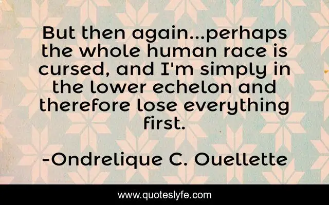 This page presents the quote "But then again...perhaps the whole human race is cursed, and I'm simply in the lower echelon and therefore lose everything first.". Author of this quote is Ondrelique C. Ouellette. This quote is about misfortune, poverty, humanity,.