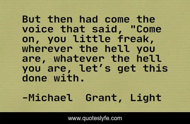 This page presents the quote "But then had come the voice that said, "Come on, you little freak, wherever the hell you are, whatever the hell you are, let’s get this done with.". Author of this quote is Michael Grant, Light. This quote is about courage, caine,.