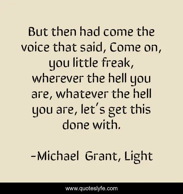 This page presents the quote "But then had come the voice that said, Come on, you little freak, wherever the hell you are, whatever the hell you are, let’s get this done with.". Author of this quote is Michael Grant, Light. This quote is about courage, caine,.
