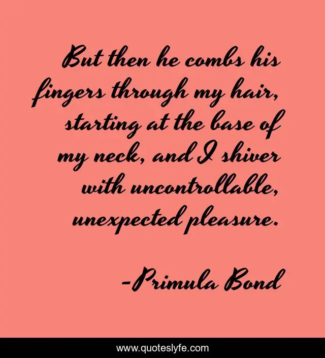 This page presents the quote "But then he combs his fingers through my hair, starting at the base of my neck, and I shiver with uncontrollable, unexpected pleasure.". Author of this quote is Primula Bond. This quote is about erotic, contemporary-romance,.
