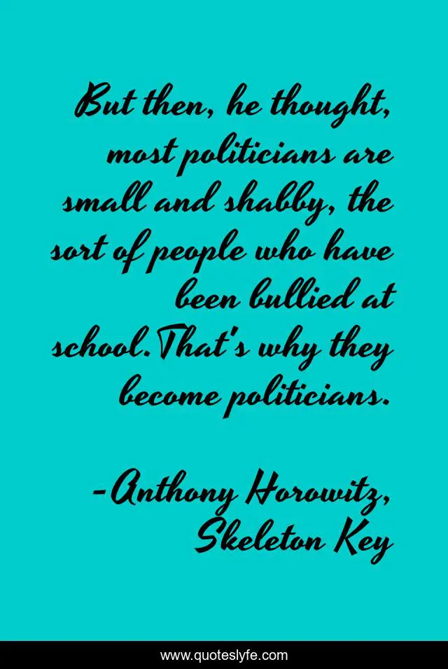 This page presents the quote "But then, he thought, most politicians are small and shabby, the sort of people who have been bullied at school.That's why they become politicians.". Author of this quote is Anthony Horowitz, Skeleton Key. This quote is about politicians, alex-rider, thoughts,.