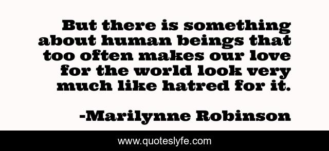 This page presents the quote "But there is something about human beings that too often makes our love for the world look very much like hatred for it.". Author of this quote is Marilynne Robinson. This quote is about hate, love, affection, world,.