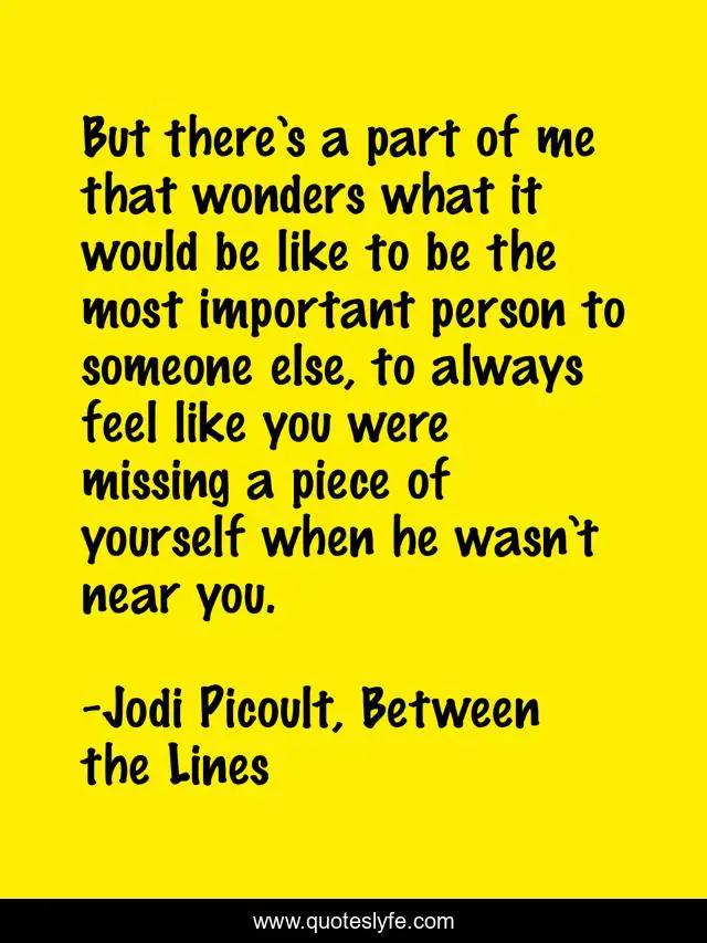 This page presents the quote "But there’s a part of me that wonders what it would be like to be the most important person to someone else, to always feel like you were missing a piece of yourself when he wasn’t near you.". Author of this quote is Jodi Picoult, Between the Lines. This quote is about romance, jodi-picoult, love, affection,.