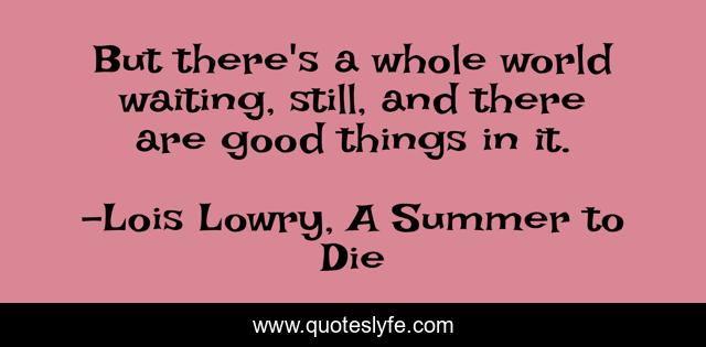 This page presents the quote "But there's a whole world waiting, still, and there are good things in it.". Author of this quote is Lois Lowry, A Summer to Die. This quote is about life, letting-go, optimism, reality, waiting, world, moving-on, hope,.