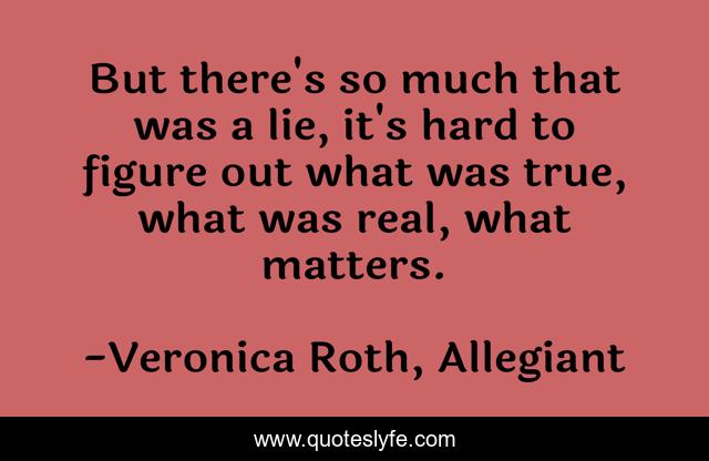 This page presents the quote "But there's so much that was a lie, it's hard to figure out what was true, what was real, what matters.". Author of this quote is Veronica Roth, Allegiant. This quote is about lie, matters, truth, reality,.