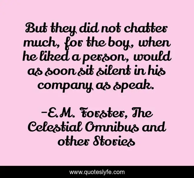 This page presents the quote "But they did not chatter much, for the boy, when he liked a person, would as soon sit silent in his company as speak.". Author of this quote is E.M. Forster, The Celestial Omnibus and other Stories. This quote is about talking, silent, silence,.