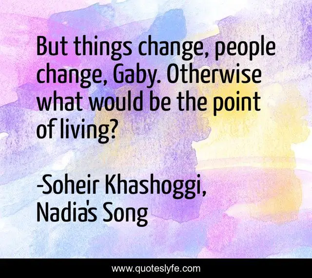 "Soheir Khashoggi, Nadia's Song Quotes." Quoteslyfe.com, 2025. Sat. 06 Dec. 2025. <https://www.quoteslyfe.com/quote/But-things-change-people-change-Gaby-Otherwise-37457>.