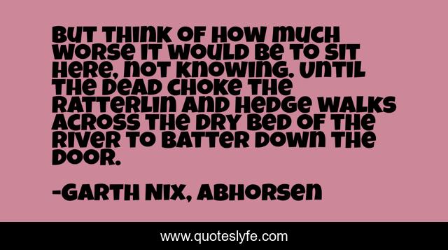 This page presents the quote "But think of how much worse it would be to sit here, not knowing. Until the Dead choke the Ratterlin and Hedge walks across the dry bed of the river to batter down the door.". Author of this quote is Garth Nix, Abhorsen. This quote is about fantasy, fear, courage,.