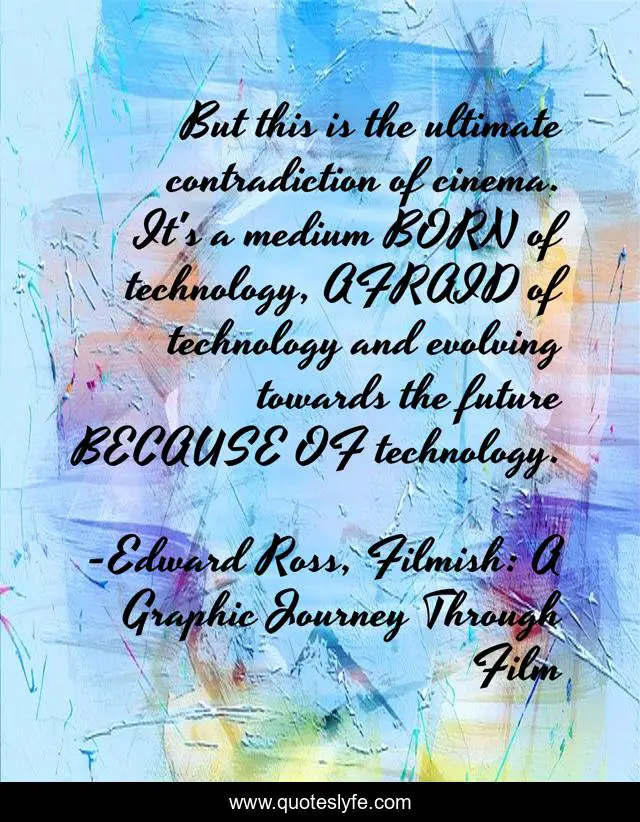 This page presents the quote "But this is the ultimate contradiction of cinema. It's a medium BORN of technology, AFRAID of technology and evolving towards the future BECAUSE OF technology.". Author of this quote is Edward Ross, Filmish: A Graphic Journey Through Film. This quote is about movie, technology, film, technology-change, cinema,.