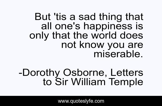 This page presents the quote "But 'tis a sad thing that all one's happiness is only that the world does not know you are miserable.". Author of this quote is Dorothy Osborne, Letters to Sir William Temple. This quote is about happiness, unhappiness,.