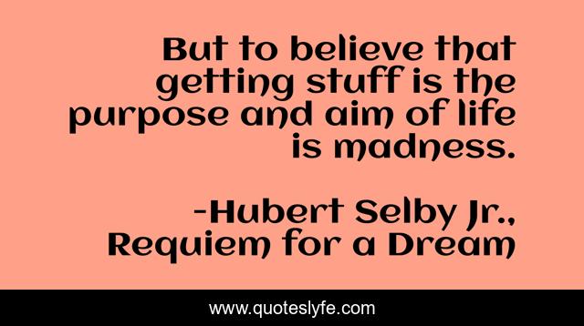 This page presents the quote "But to believe that getting stuff is the purpose and aim of life is madness.". Author of this quote is Hubert Selby Jr., Requiem for a Dream. This quote is about life, work, goals,.
