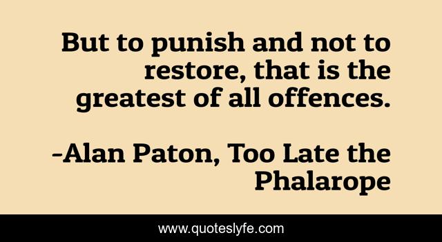 This page presents the quote "But to punish and not to restore, that is the greatest of all offences.". Author of this quote is Alan Paton, Too Late the Phalarope. This quote is about restore, justice, punish, offences, restoration, offence, punishment,.