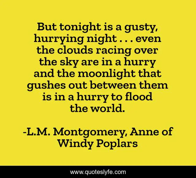 This page presents the quote "But tonight is a gusty, hurrying night . . . even the clouds racing over the sky are in a hurry and the moonlight that gushes out between them is in a hurry to flood the world.". Author of this quote is L.M. Montgomery, Anne of Windy Poplars. This quote is about anne-of-green-gables, evening, clouds, sky, nighttime, moonlight, night,.