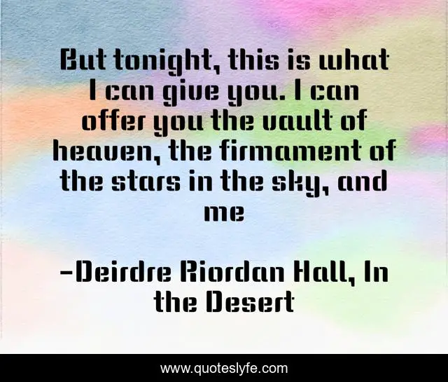 This page presents the quote "But tonight, this is what I can give you. I can offer you the vault of heaven, the firmament of the stars in the sky, and me". Author of this quote is Deirdre Riordan Hall, In the Desert. This quote is about true-love, new-adult, love, road-trip, romance, rock-and-roll, love-story, affection,.