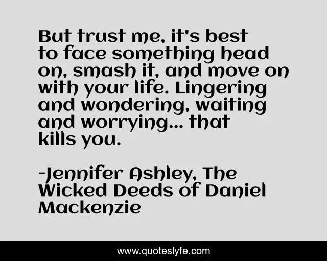 This page presents the quote "But trust me, it's best to face something head on, smash it, and move on with your life. Lingering and wondering, waiting and worrying... that kills you.". Author of this quote is Jennifer Ashley, The Wicked Deeds of Daniel Mackenzie. .