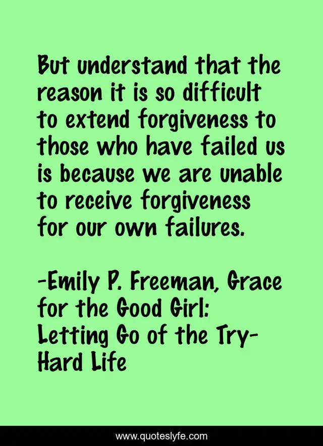 This page presents the quote "But understand that the reason it is so difficult to extend forgiveness to those who have failed us is because we are unable to receive forgiveness for our own failures.". Author of this quote is Emily P. Freeman, Grace for the Good Girl: Letting Go of the Try-Hard Life. This quote is about failures, forgiveness,.