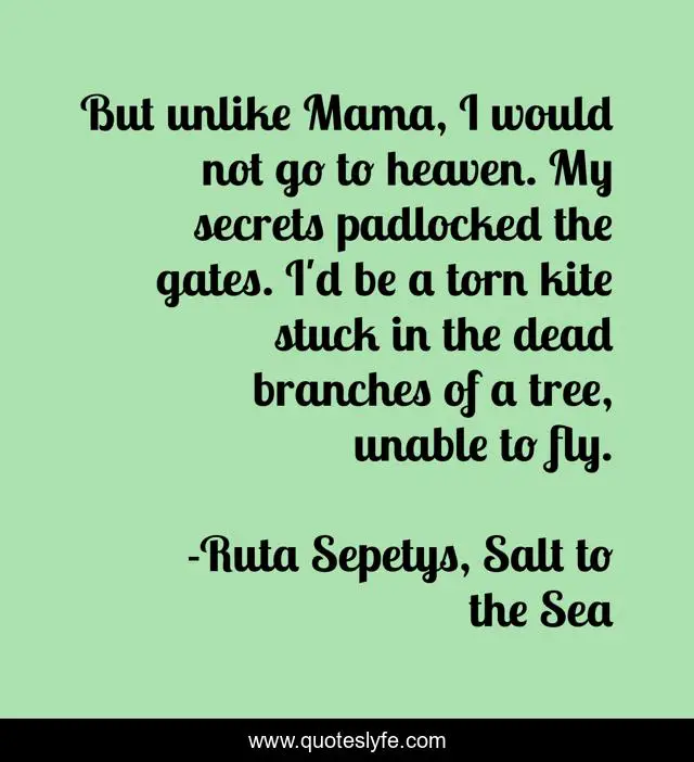 This page presents the quote "But unlike Mama, I would not go to heaven. My secrets padlocked the gates. I'd be a torn kite stuck in the dead branches of a tree, unable to fly.". Author of this quote is Ruta Sepetys, Salt to the Sea. This quote is about loss, heaven, metaphor, kite, family, salt-to-the-sea, afterlife, refugee, stuck,.