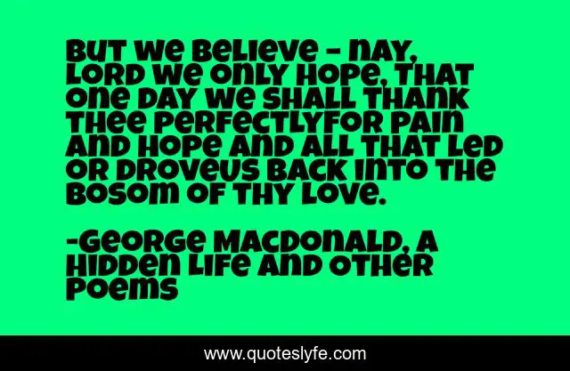 This page presents the quote "But we believe – nay, Lord we only hope, That one day we shall thank thee perfectlyFor pain and hope and all that led or droveUs back into the bosom of thy love.". Author of this quote is George MacDonald, A Hidden Life and Other Poems. This quote is about pain, adversity, hope,.