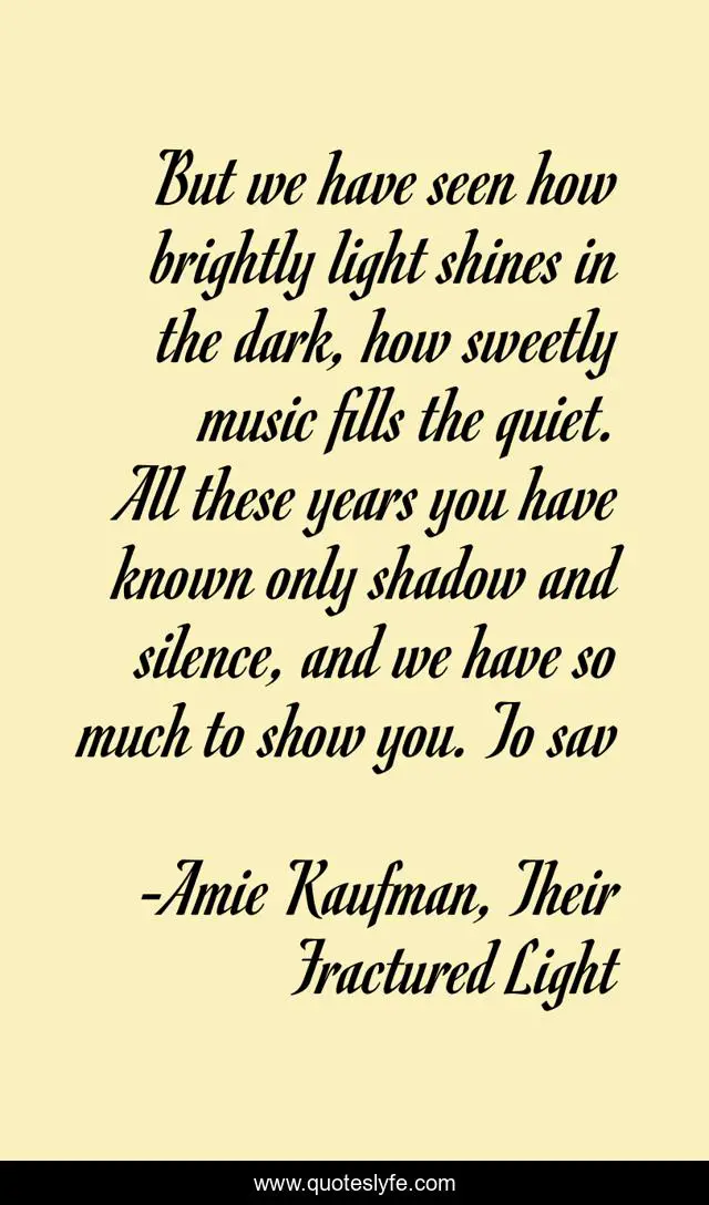 This page presents the quote "But we have seen how brightly light shines in the dark, how sweetly music fills the quiet. All these years you have known only shadow and silence, and we have so much to show you. To sav". Author of this quote is Amie Kaufman, Their Fractured Light. This quote is about faith, worth,.