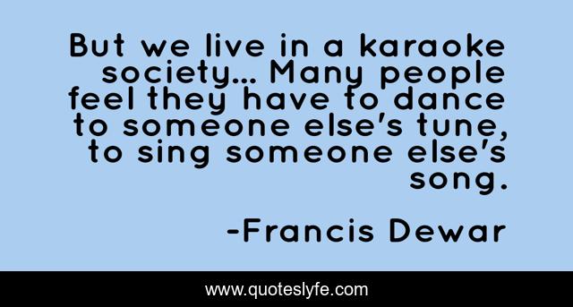 This page presents the quote "But we live in a karaoke society... Many people feel they have to dance to someone else's tune, to sing someone else's song.". Author of this quote is Francis Dewar. .