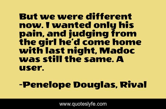 This page presents the quote "But we were different now. I wanted only his pain, and judging from the girl he’d come home with last night, Madoc was still the same. A user.". Author of this quote is Penelope Douglas, Rival. This quote is about enthusiasm, beautiful-writing, amazing-book, inspirational,.