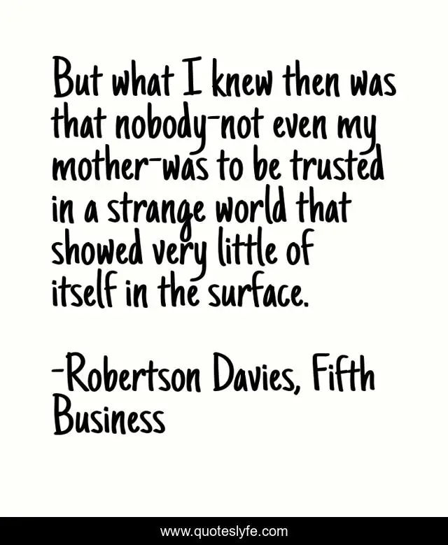This page presents the quote "But what I knew then was that nobody-not even my mother-was to be trusted in a strange world that showed very little of itself in the surface.". Author of this quote is Robertson Davies, Fifth Business. .