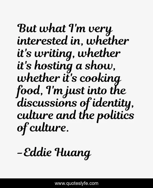 This page presents the quote "But what I'm very interested in, whether it's writing, whether it's hosting a show, whether it's cooking food, I'm just into the discussions of identity, culture and the politics of culture.". Author of this quote is Eddie Huang. This quote is about food, culture, writing,.