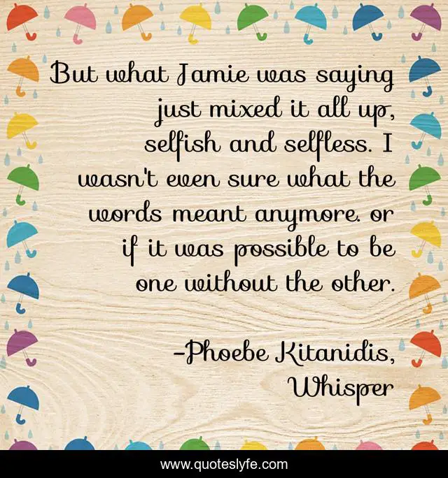 This page presents the quote "But what Jamie was saying just mixed it all up, selfish and selfless. I wasn't even sure what the words meant anymore. or if it was possible to be one without the other.". Author of this quote is Phoebe Kitanidis, Whisper. .