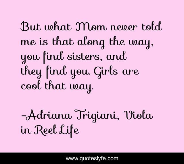 This page presents the quote "But what Mom never told me is that along the way, you find sisters, and they find you. Girls are cool that way.". Author of this quote is Adriana Trigiani, Viola in Reel Life. This quote is about sisters, friends, girls, mother,.