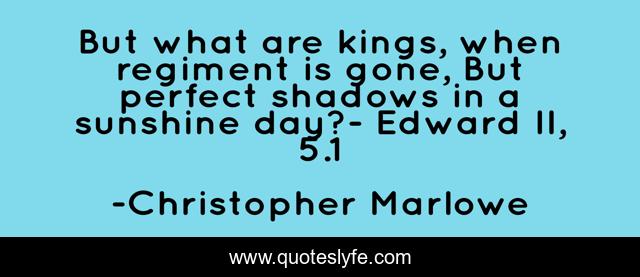 This page presents the quote "But what are kings, when regiment is gone, But perfect shadows in a sunshine day?- Edward II, 5.1". Author of this quote is Christopher Marlowe. This quote is about drama, kings,.