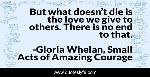This page presents the quote "But what doesn’t die is the love we give to others. There is no end to that.". Author of this quote is Gloria Whelan, Small Acts of Amazing Courage. This quote is about eternity, love, affection, lasting,.