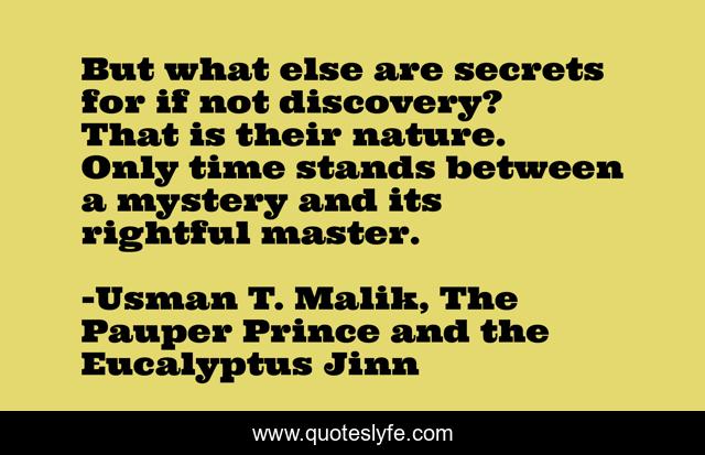 This page presents the quote "But what else are secrets for if not discovery? That is their nature. Only time stands between a mystery and its rightful master.". Author of this quote is Usman T. Malik, The Pauper Prince and the Eucalyptus Jinn. This quote is about islam, fantasy, sufi, mythology,.