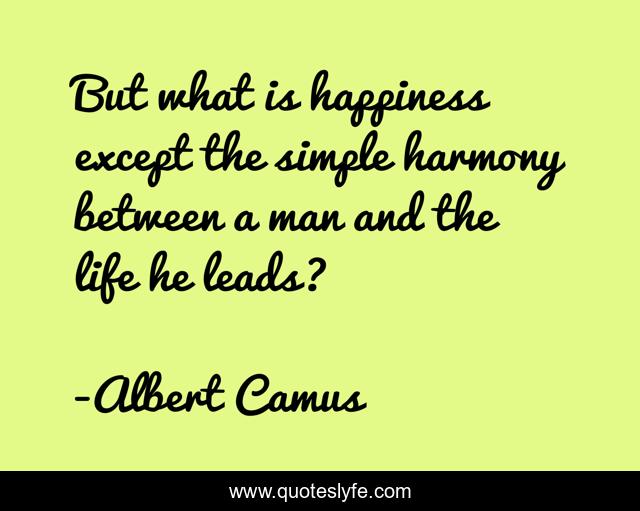 This page presents the quote "But what is happiness except the simple harmony between a man and the life he leads?". Author of this quote is Albert Camus. .