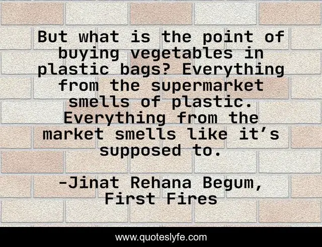 This page presents the quote "But what is the point of buying vegetables in plastic bags? Everything from the supermarket smells of plastic. Everything from the market smells like it’s supposed to.". Author of this quote is Jinat Rehana Begum, First Fires. This quote is about supermarkets, vegetables, grocery-shopping, materialism,.