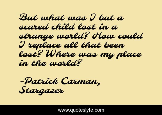 This page presents the quote "But what was I but a scared child lost in a strange world? How could I replace all that been lost? Where was my place in the world?". Author of this quote is Patrick Carman, Stargazer. This quote is about scared, child, land-of-elyon, lost, finding-your-place,.