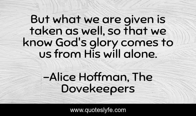 This page presents the quote "But what we are given is taken as well, so that we know God's glory comes to us from His will alone.". Author of this quote is Alice Hoffman, The Dovekeepers. This quote is about god, emptiness,.