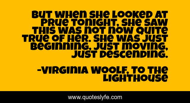 This page presents the quote "But when she looked at Prue tonight, she saw this was not now quite true of her. She was just beginning, just moving, just descending.". Author of this quote is Virginia Woolf, To the Lighthouse. This quote is about coming-of-age, girls, women,.