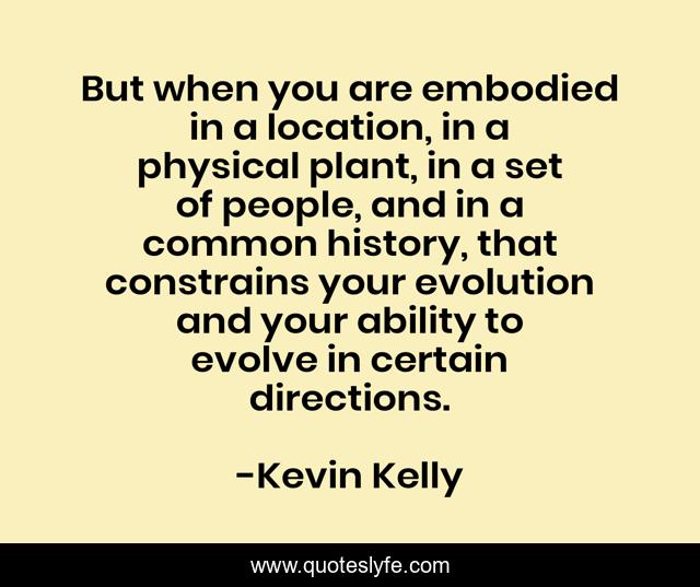 This page presents the quote "But when you are embodied in a location, in a physical plant, in a set of people, and in a common history, that constrains your evolution and your ability to evolve in certain directions.". Author of this quote is Kevin Kelly. This quote is about plant, evolution, people,.