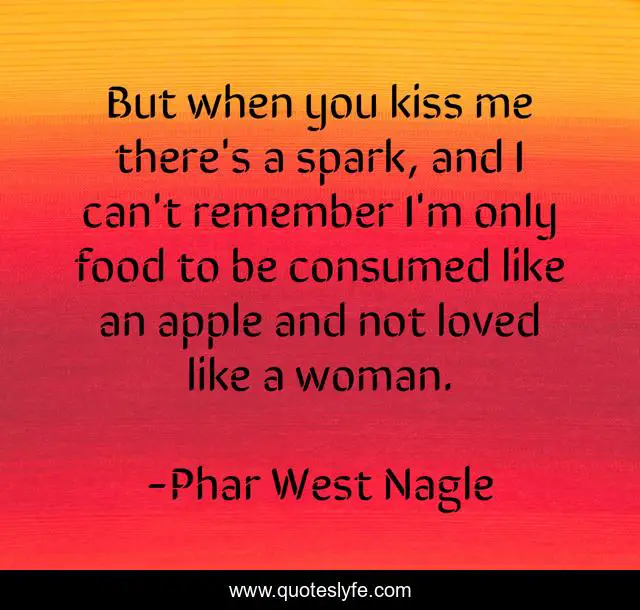 This page presents the quote "But when you kiss me there's a spark, and I can't remember I'm only food to be consumed like an apple and not loved like a woman.". Author of this quote is Phar West Nagle. This quote is about relationships, love, love-poetry, poetry, heartbreak, affection,.