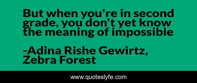 This page presents the quote "But when you're in second grade, you don't yet know the meaning of impossible". Author of this quote is Adina Rishe Gewirtz, Zebra Forest. This quote is about impossible, wishes, possible,.