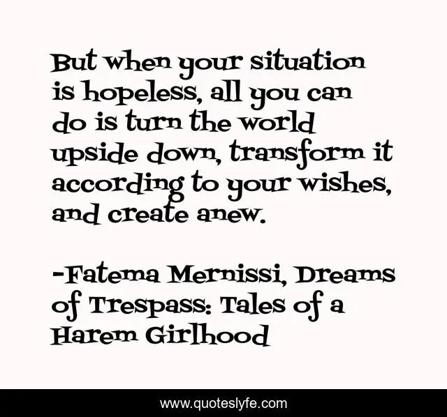 This page presents the quote "But when your situation is hopeless, all you can do is turn the world upside down, transform it according to your wishes, and create anew.". Author of this quote is Fatema Mernissi, Dreams of Trespass: Tales of a Harem Girlhood. .