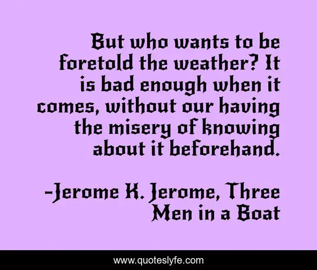 This page presents the quote "But who wants to be foretold the weather? It is bad enough when it comes, without our having the misery of knowing about it beforehand.". Author of this quote is Jerome K. Jerome, Three Men in a Boat. This quote is about weather, humor, humour,.
