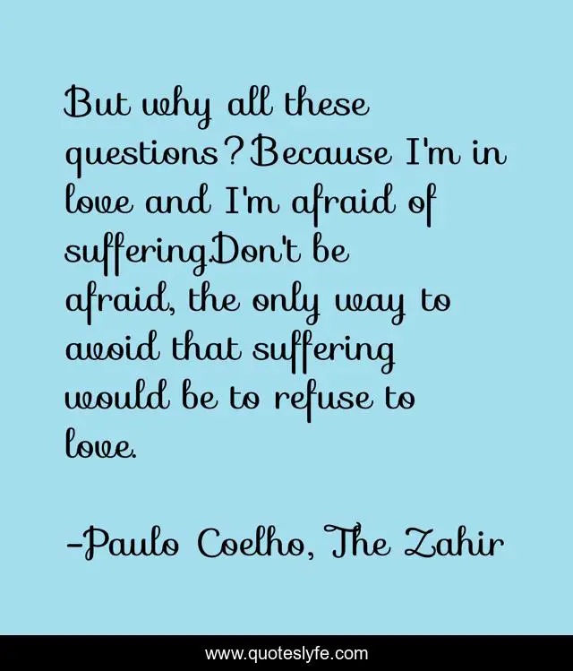 This page presents the quote "But why all these questions?Because I'm in love and I'm afraid of suffering.Don't be afraid, the only way to avoid that suffering would be to refuse to love.". Author of this quote is Paulo Coelho, The Zahir. This quote is about love, suffering, pain, affection,.