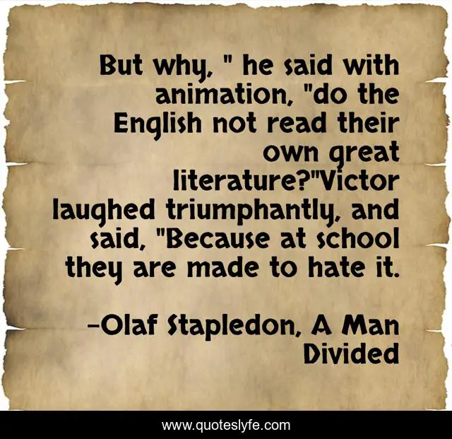 This page presents the quote "But why, " he said with animation, "do the English not read their own great literature?"Victor laughed triumphantly, and said, "Because at school they are made to hate it.". Author of this quote is Olaf Stapledon, A Man Divided. This quote is about reading-books, literature, reading, english-literature,.