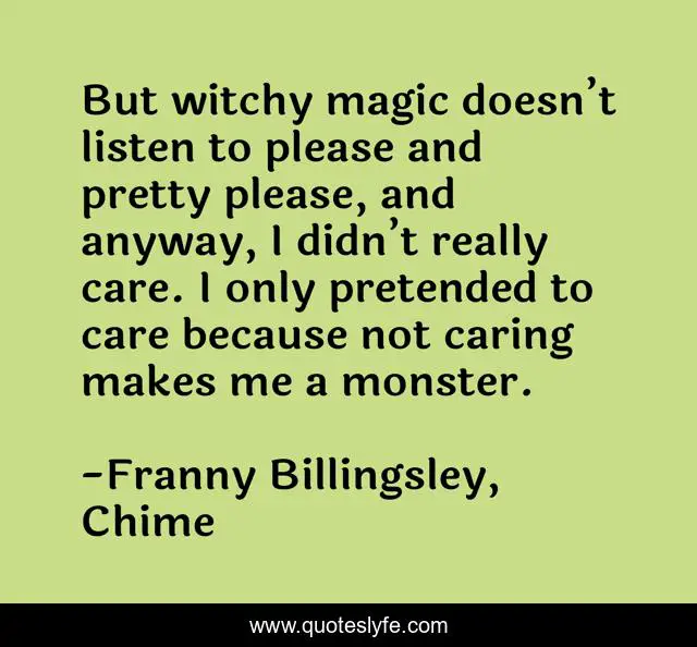 This page presents the quote "But witchy magic doesn’t listen to please and pretty please, and anyway, I didn’t really care. I only pretended to care because not caring makes me a monster.". Author of this quote is Franny Billingsley, Chime. This quote is about magic, facades, witches,.