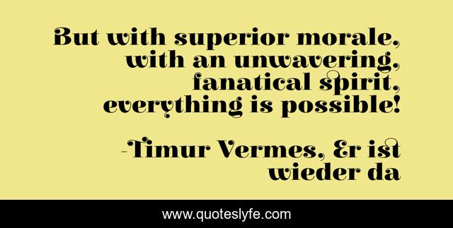 This page presents the quote "But with superior morale, with an unwavering, fanatical spirit, everything is possible!". Author of this quote is Timur Vermes, Er ist wieder da. This quote is about positive, confidence, motivational, possible, optimistic,.