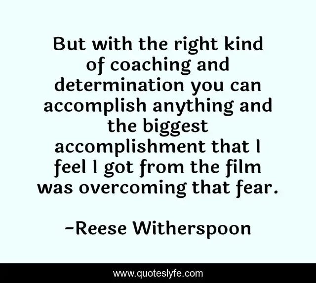 This page presents the quote "But with the right kind of coaching and determination you can accomplish anything and the biggest accomplishment that I feel I got from the film was overcoming that fear.". Author of this quote is Reese Witherspoon. This quote is about determination, overcoming,.