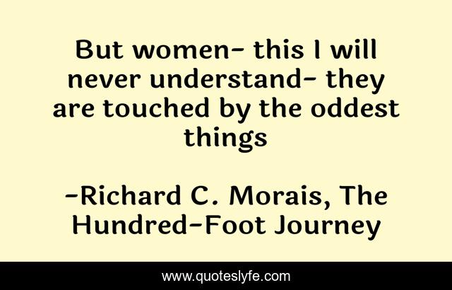 This page presents the quote "But women- this I will never understand- they are touched by the oddest things". Author of this quote is Richard C. Morais, The Hundred-Foot Journey. This quote is about feelings, women,.