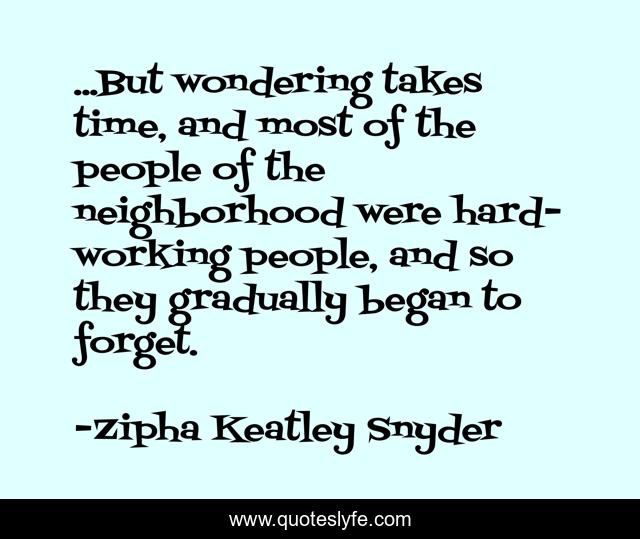 This page presents the quote "...But wondering takes time, and most of the people of the neighborhood were hard-working people, and so they gradually began to forget.". Author of this quote is Zipha Keatley Snyder. .